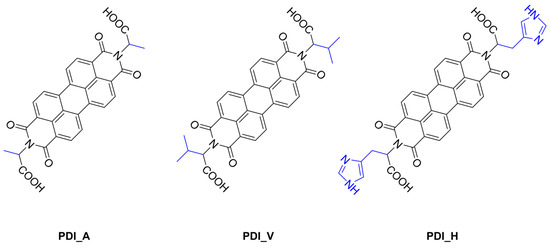 In this work, we synthesized derivatives of perylene diimide substituted with three types of L-amino acid (PDI_AAs) through the reaction of anhydride with amine, which is one of the well-known synthetic pathways used in the literature. (The detailed procedures are described in the experimental section) [27,28,29]. The chemical structures of the as-synthesized PDI_AAs series (PDI_A, PDI_V, and PDI_H) are shown in Scheme 1 and confirmed by 1H NMR and 13C NMR (Figures S1–S6). In addition, the ATR FT-IR absorption spectrum of the as-synthesized PDI_AAs shows the typical bands corresponding to imide C=O vibrations (symmetric and asymmetric stretch), carboxylic acid C=O stretch, and imide C-N stretch in Figures S7–S9.