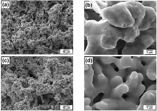 SEM images of the pristine samples prepared by co-precipitation and subsequent reductive thermolysis: (a,b) 100Ni; (c,d) 96Ni-4W.