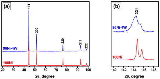 XRD profiles for 96Ni-4W alloy and 100Ni: survey patterns (a) and 331 reflections in the far angle range (b).