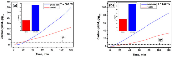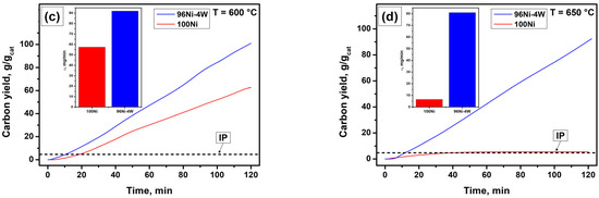 Thereby, a comparison of the catalytic activity of 100Ni and alloyed 96Ni-4W catalyst revealed that even a small amount of tungsten (4 wt%) has a significant positive impact upon the catalyst performance of nickel, which is reflected by a remarkable shortening of the IP duration as well as by an increase in the carbon product growth rate (Table 1).
