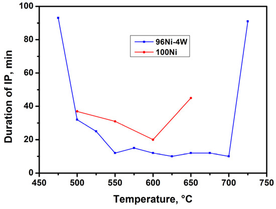 Figure 4 shows the dependence of IP duration on temperature for both catalyst samples. As can be seen from the plot, for the 96Ni-4W alloy, the duration of IP varies insignificantly (10–15 min) in a temperature interval of 550–700 °C. This indicates that the carbon erosion process proceeds at approximately the same rates within a wide temperature range. In turn, for the monometallic reference sample (100Ni), the minimum duration of IP at 600 °C was equal to 20 min, which is 2 times higher than that for the 96Ni-4W alloy. At higher temperatures (650 °C), it takes a much longer time (40 min) for a pure nickel sample to disintegrate, which testifies to a much lower rate of the CE process. The observed effect can be explained by the deposition of amorphous carbon due to the decomposition of TCE on the outer surface of metal agglomerates, which leads to a surface blockage and a decrease in the rate of carbon transfer into the bulk of nickel. In the case of the 100Ni monometallic sample, the high-temperature deactivation occurs at T~650 °C. Meanwhile, the introduction of W into the Ni-alloy results in a noticeable rise in the deactivation temperature (up to 700 °C). It should be noted that the IP duration for 96Ni-4W alloy has very close values in the temperature range of 550–700 °C. Most probably, the addition of W makes the alloy more resistant to chlorination at lower temperatures, and this fact determines an increase in the CE rate.