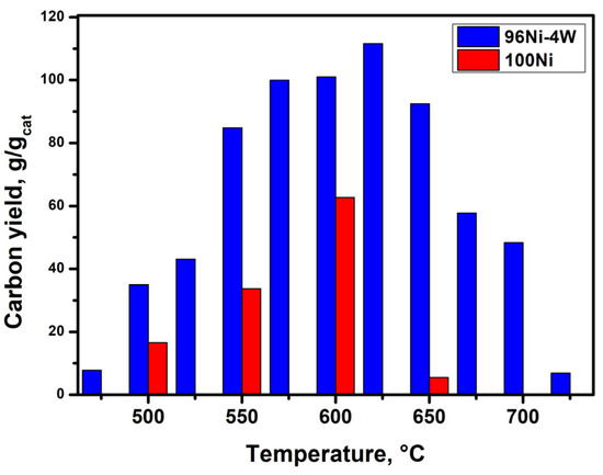 In the next step, a comparative analysis of the second stage of the TCE decomposition over the studied catalysts was performed. Figure 7 shows a diagram demonstrating the dependence of the 2-h carbon product yield on the temperature. As can be seen from the experimental results, the maximum productivity of pure 100Ni was 63 g/gcat at a temperature of 600 °C. It should be reminded that the minimum duration of IP (20 min) for pure nickel is also observed at this temperature point. Meanwhile, the maximum yield of CNF for the 96Ni-4W catalyst was as high as 112 g/gcat, which is almost two times higher than that for the unmodified nickel. As can be seen from the data presented in Figure 7, the alloyed Ni-W catalyst outperforms the reference sample (pure nickel) in productivity within the entire 475–725 °C temperature range. Based on the literature data concerning the decomposition of 1,2-dichloroethane (C2H4Cl2) at the same conditions, one can find that the maximum yield, in this case, did not exceed 45 g/gcat [35]. It is also worth emphasizing that the productivity of the 96Ni-4W alloy at temperatures from 575 to 650 °C remains very high and changes very slightly (102 ± 10 g/gcat). The observed fact might be taken into account when scaling the process up since the lowest possible temperature is one of the important criteria to ensure the efficient realization of the TCE processing.