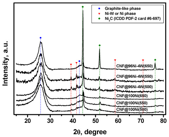 As mentioned above, the solid-phase product of the catalytic pyrolysis of C2HCl3 vapors is represented by a nanostructured carbon material grown on dispersed active particles originating from the disintegration of the pristine samples. The results of the XRD analysis of the carbon materials are presented in Figure 8. In the diffraction patterns of studied samples, the graphite-like phase can be identified as the predominant phase (2Θ~26°). The second phase is represented by the dispersed metal particles (Ni or Ni-W alloy) present in the sample after the reaction. In addition, there are traces of the Ni3C phase registered for the CNF samples, obtained at 500–550 °C (Figure 8). The presence of nickel carbide is consistent with the supposed mechanism of the catalytic growth of carbon nanofibers known as the “carbide cycle mechanism” [51].