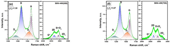 Among the group of second-order bands, the most intensive ones are the bands 2D at ~2677 cm−1 and D + D2 at ~2927 cm−1. The other bands, 2D2 and G*~D4 + D, are of noticeably lower intensity. In order to approximate the second-order lines, excluding the 96Ni-4W(475) and 96Ni-4W(500) samples, a set of bands 2D and D + D2 of lower intensity and sufficiently higher half-width should be used. It is worth noting that for comparative analysis of the data obtained by Raman spectroscopy and other methods, it should be taken into account that the information provided by Raman spectroscopy for carbon materials corresponds to a laser penetration depth of ~0.1–0.2 μm [57].