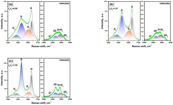 Raman spectra of the carbon product formed over the 100Ni(T) samples for T = 500, 590, and 620 °C are shown in Figure 11. The corresponding dependences of the main parameters on the synthesis temperature are summarized in Figure 10b. As can be seen, these samples are characterized by a higher portion of the amorphous carbon (ID3/IG ratio) at 500 °C if compared with the case of 96Ni-4W. An increase in temperature leads to the rapid growth of the in-plane crystallite sizes (La) along with a decrease in the amorphous carbon portion (ID3/IG ratio). However, this process is also accompanied by a deceleration of the catalytic reaction leading to its complete cessation at 650 °C. This allows concluding that the observable phenomenon of carbon ordering is connected with the decelerated carbon growth near the edge of the temperature window.