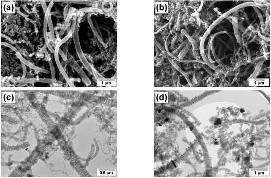 SEM (a,b) and TEM (c,d) images of the carbon product obtained by the decomposition of TCE at 600 °C over catalysts: (a,c) 100Ni; (b,d) 96Ni-4W.