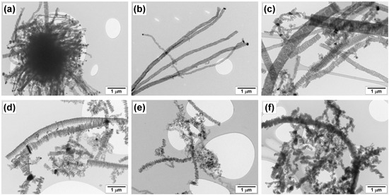 TEM images of the carbon product obtained via decomposition of TCE over 96Ni-4W alloy at temperatures: (a) 475 °C; (b) 500 °C; (c) 550 °C; (d) 600 °C; (e) 650 °C; (f) 700 °C.