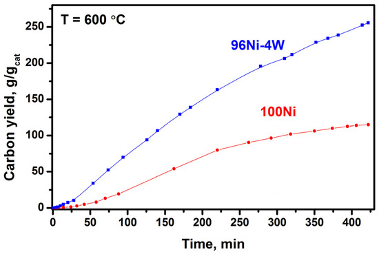 Additionally, a significant promoting effect of the tungsten addition was found, which is manifested in: (i) a 2-fold shortening of the IP duration; (ii) a 3-fold increase in the carbon deposition rate; and iii) an increase in the carbon productivity from 63 g/gcat to 101 g/gcat (600 °C, 2 h). The longevity tests revealed that the Ni-W alloy showed much better tolerance to deactivation, demonstrating the extremely high yield of 256 g/gcat for 7 h, which is two times higher than that for the unmodified nickel.