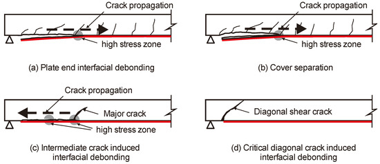 Typical EBR FRP debonding failure modes of RC slabs (adapted from [7]). (a) Plate end interfacial debonding; (b) Cover separation; (c) Intermediate crack induced interfacial debonding; (d) Critical diagonal crack induced interfacial debonding.