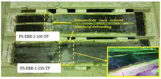 The five slabs were subjected to monotonic load until failure. The mid-span deflection behavior of the slabs was monitored using vertical displacement transducers located at the soffit. As expected, the ultimate failure of the slabs was controlled by debonding of the CFRP sheets at the free end anchorage for all of the strengthened specimens. Figure 5 shows the intermediate crack-induced interfacial debonding failure of specimens with tapering-end CFRP sheets (PS-EBR-2-100-TP and PS-EBR-1-250-TP). For the specimen without tapering (PS-EBR-2-100), end-debonding failure of CFRP was observed at the left side of the specimen, as shown in Figure 6.