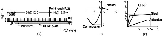 (a) FE mesh and geometry, (b) concrete constitutive model and (c) reinforcement (CFRP/steel/adhesive).