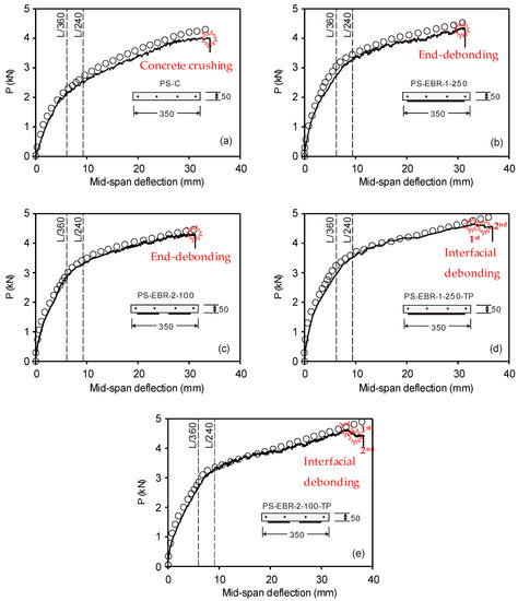 Figure 8a–e compares experimental load-deflection with the numerical predictions given by the FE models. For the control specimen (PS-C), the specimen failed by concrete crushing at the ultimate load of 3.98 kN and deflection of 32.8 mm. When considering the deflection limit of L/360 = 2300/360 = 6.38 mm, this occurs at a load level of 2.15 kN. The load level increases to 2.56 kN at L/240, as well as the deflection limit for a strengthened prestressed slab. The design live load of this slab is 1.5 kN for typical houses, and therefore, the test result evidenced that the design of the control PS-C was satisfactory. In the case of the strengthened slabs without tapering PS-EBR-1-250 and PS-EBR-2-100 (Figure 8b,c), it was found that the end-debonding failure (i.e., Figure 6) occurred. This occurred at the ultimate loads of 4.35 kN and 4.20 kN, respectively, as shown in Figure 8b,c. When considering the load level at deflection limit of L/360, it was found that the load level of PS-EBR-1-250 and PS-EBR-2-100 increased to 2.71 kN and 2.82 kN, respectively, which were 126% and 131% higher compared to the control PS-C.