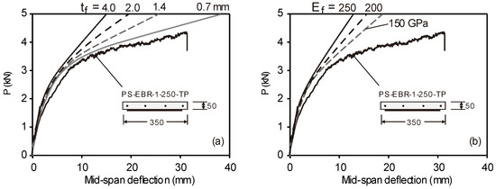 The results in Figure 8a–e also show that the higher the load, the stiffer the response is obtained from the FE results compared to the experimental results (e.g., defection at failure from FE model is 13.3 mm vs. 17.1 mm from PS-C). Nevertheless, the FE models predict reasonably well the load and corresponding deflection up to 2.25 kN, which is considered sufficient to represent the point of service condition (i.e., a deflection = L/360). This is also consistent with the findings reported in previous studies [6,7,8]. At higher load levels, the deflections obtained from FE models are lower than the experimental values due to several cracks being developed after the service load level is reached. For CFRP-strengthened slabs, the FE models predict better the results compared to unstrengthened specimens up to a load level of approximately 75% of the ultimate load level. Moreover, the FE models predicts 20–25% lower deflections at ultimate load. It is also noted that the numerical prediction in this study did not capture the failure due to end-debonding or interfacial debonding (i.e., Figure 1), since perfect bonding between CFRP and concrete surface was assumed in the analysis, and thus, no separation was allowed to occur in the FE analysis. It is also interesting that numerical predictions agreed well with experimental results after service load level. This can be attributed to the fact that major cracks are prevented by the CFRP sheets bonded at the slabs’ soffit.