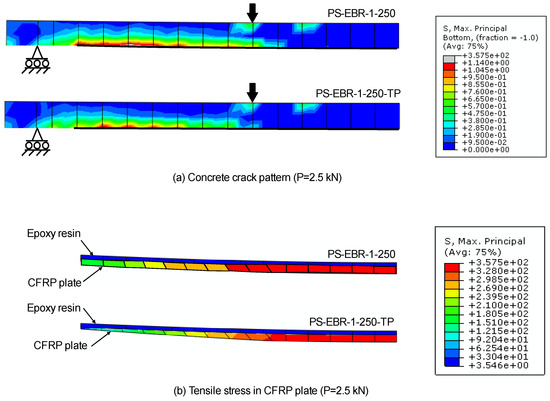 Figure 10a,b show, correspondingly, the contour plots of principal tensile stress (Smax) and shear stress (S11) of the concrete–adhesive interface of the CFRP-strengthened slabs without end-tapering (PS-EBR-250) and with end-tapering (PS-EBR-250-TP). In these plots, the thickness of the CFRP varied from 1.0 to 1.4 mm in PS-EBR-250-TP to compare with the 1.4 mm of CFRP in PS-EBR-250. The development of the principal stresses in the FE model can be used to identify the concentration of stresses in the concrete, CFRP sheets and adhesive resin. As a failure ratio of 0.037 was used (i.e., the tensile stress of concrete input in Abaqus® was 1.14 MPa), a diagonal crack in the concrete would occur when the tensile stress in the concrete (at the end of the plate) reaches its ultimate strength. However, the full composite action is assumed in this modeling exercise, which makes the analysis run completely until a compressive failure of concrete occurs. At this point, the maximum tensile stress in the CFRP sheets can be used to examine the effectiveness of the FRP strengthening before the beam starts to develop diagonal cracking, loses its composite action and eventually fails due to FRP debonding (i.e., Figure 10a). The results confirm that the use of end-tapering at the end anchorage of the CFRP sheets reduces the stresses compared to the slab without end tapering (see Figure 10b).