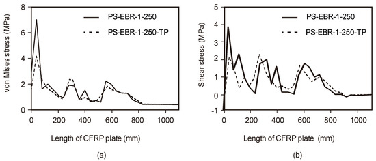 Figure 11a compares the CFRP–concrete interfacial principal stresses of slabs without (PS-EBR-250) and with tapering (PS-EBR-250-TP) as a function of the length of the CFRP plate sheets. Likewise, Figure 11a compares analogous results but for shear stresses of such slabs. The results in these figures show that the end-tapering technique has an advantage in making the FRP plate by reducing both von Mises and shear stresses and make it susceptible to early debonding. In these plots, two FRP plates with different thicknesses (constant tf = 1.4 mm and tapering tf = 1–1.4 mm) are used to investigate the principal and shear stresses of the slabs and the FRP plates. Figure 11a,b indicate that the principal stress and shear stress concentrate at the end of the CFRP sheets if a constant thickness (tf = 1.4 mm) is considered. The concentration of these stresses is found to be the cause of debonding due to rip-off or peel-off. Conversely, the tapering reduces the principal stresses (by up to 15%) and shear stresses (by up to 10%) along the anchorage length, thus, re-distributing stresses towards the beam mid-span. Therefore, tapering is extremely successful in reducing the stresses by up to 15%, which can be sufficient to prevent concrete rip-off and peel-off FRP debonding failures.