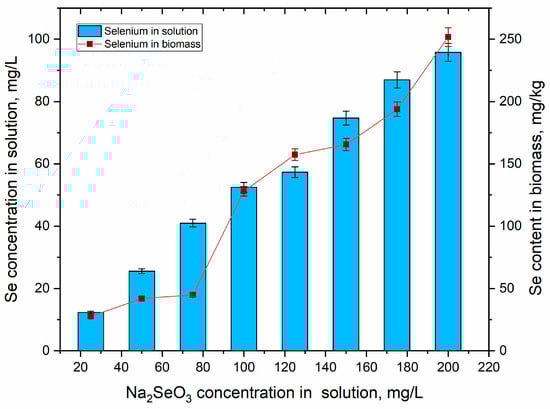 Selenium accumulation in Arthrospira platensis biomass (n = 3, the error bars represent the standard deviation of the measurements).