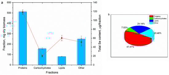 Amount of Se accumulated in biomass fractions: (a) total content of Se, µg Se/g per fraction; (b) distribution of Se accumulated by fractions, % of the accumulated amount (n = 3, the error bars represent the standard deviation of the measurements).