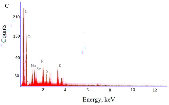 The morphology of spirulina cells (control and exposed to selenium) was described using a JEM-1400 transmission electron microscope (Jeol, Akishima, Japan) at an accelerating voltage of 100 kW. Microprobe analysis of SeNPs was conducted with an energy-dispersive X-ray analysis spectrometer (EDAX, Pleasanton, CA, USA). The acquisition time ranged from 60 to 100 s, and the accelerating voltage was 20 kV.