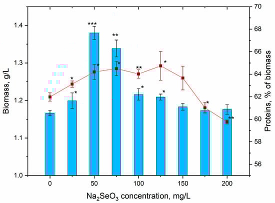 Accumulation of Arthrospira platensis biomass and content of protein in biomass under conditions of supplementing the nutrient medium with sodium selenite (* p < 0.05, ** p < 0.005, *** p < 0.0005 for differences between control and experimental sample; n = 3). The error bars represent the standard deviation of the measurements.
