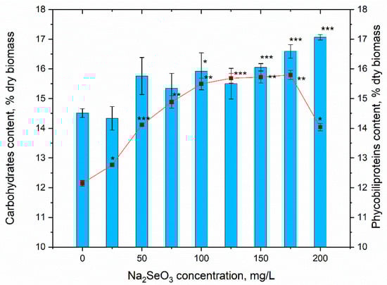 The content of carbohydrates and phycobiliptoteins in Arthrospira platensis biomass under conditions of supplementing the nutrient medium with sodium selenite (* p < 0.05, ** p < 0.005, *** p < 0.0005 for differences between control and experimental sample; n = 3). The error bars represent the standard deviation of the measurements.