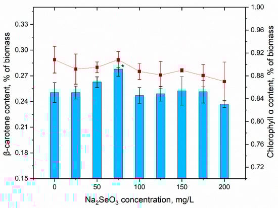 The content of β carotene and chlorophyll a in Arthrospira platensis biomass under conditions of supplementing the nutrient medium with sodium selenite (* p < 0.05 for differences between control and experimental sample; n = 3). The error bars represent the standard deviation of the measurements.