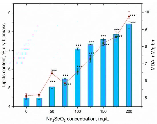 The content of lipids and MDA in Arthrospira platensis biomass under conditions of supplementing the nutrient medium with sodium selenite (*** p < 0.0005 for differences between control and experimental sample; n = 3). The error bars represent the standard deviation of the measurements.