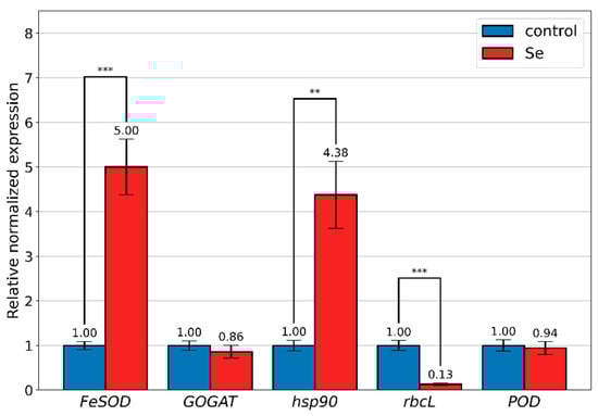 Relative expression difference in selected genes between control A. platensis and after Se treatment (200 mg/L of Na2SeO3), ** p < 0.01, *** p < 0.001; n = 3. The error bars represent the standard deviation of the measurements.