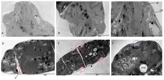 Such changes are typical for A. platensis cells exposed to various external actions and stress factors. For example, in the case of the action of heavy metals (Cd), first of all, the disintegration and disorganization of thylakoid membranes, as well as the appearance of polyphosphate bodies [] are observed. Destruction of photosynthetic membranes and storage of carbon reserves in the form of polyhydroxyalkanoates was also observed in spirulina under conditions of insufficient nutrients, especially nitrogen [].