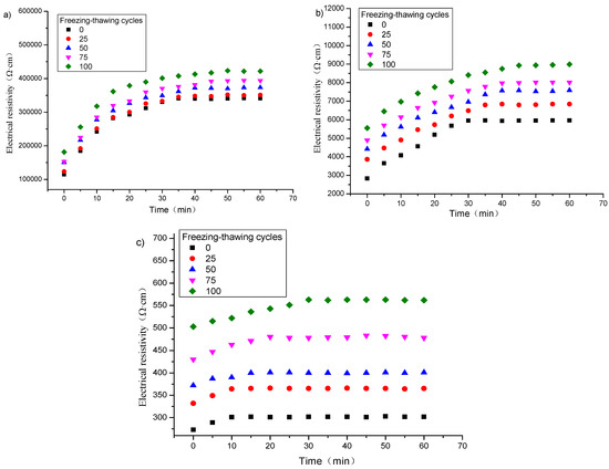 Figure 2 shows the change of electrical resistivity with time of specimens with graphene content of 1, 2 and 3% after different freeze–thaw cycles. It can be seen from Figure 2, that for the specimens with the same graphene content, the number of freeze–thaw cycles has little effect on the shape of the resistivity-time curve. Furthermore, the initial resistivity and the stable resistivity gradually increase with the increase of the number of freeze–thaw cycles.