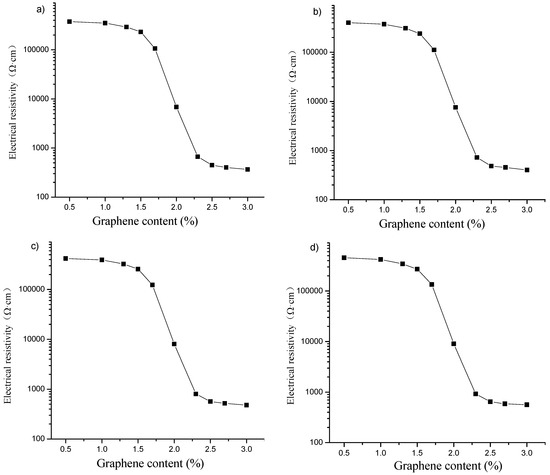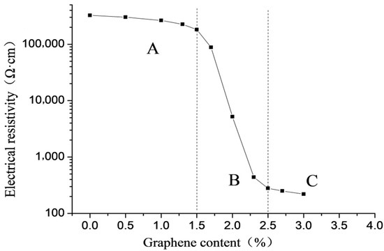 The change of the electrical resistivity of the specimen not subjected to freeze–thaw action with the content of graphene is plotted in Figure 3. The resistivity in this case was measured by DC four-probe method [27]. It is noted that the graphene content can be roughly divided into three zones according to variation curve of electrical resistivity with graphene content. Zone A refers to the range of 0 to 1.5% of the content of graphene, which is characterized by small influence of the content of graphene on the electrical resistivity, and large electrical resistivity of the specimen. The range of graphene content between 1.5 and 2.5% is defined as the percolation transition zone, and expressed as zone B. The characteristic of this zone is that the resistivity decreases sharply with the increase of graphene content, which can eventually be reduced by three orders of magnitude. Zone C indicates the range from more than 2.5% to a certain amount of graphene content. The feature of this zone is that the graphene content has little effect on the resistivity and the resistivity of the specimen is small. Graphene content of 1.5 and 2.5% are the upper and lower thresholds of the percolation transition zone, respectively.