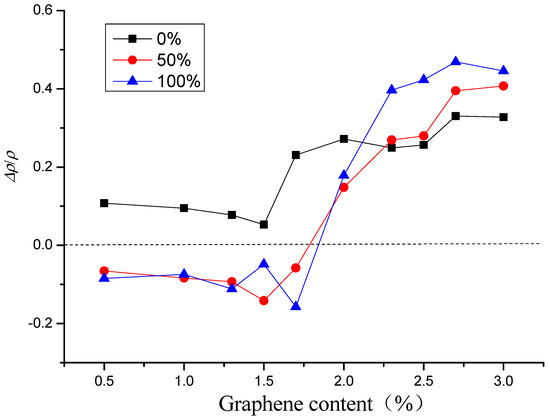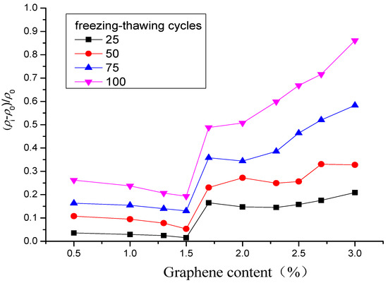 As presented in Figure 11, when the content of graphene is in the range of 0~1.7%, the relative change rate of electrical resistivity after freeze–thaw in dry state is greater than zero, for the relative water content of 50 or 100%, the relative change rates of resistivity in both cases are close to and both less than zero. When the graphene content is greater than 1.7%, all the relative change rates of resistivity increase rapidly. As the graphene content continues to increase, finally, the greater the relative water content, the greater the relative change rate of resistivity.