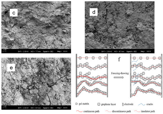 Figure 7 depicts the SEM images and conductive path schematic plot of the graphene-based cement composites after freeze–thaw cycles. As observed, the left figure in Figure 7f illustrates several conductive paths in the composite before freeze–thaw. The first path above is the insulation path. At this time, the graphene particles are independent and sparsely distributed. The second is a discontinuous conductive path, in which the graphene clusters close to each other or in contact form a tunneling conduction. The third is the contacting conduction path. The graphene particles contact each other and stack continuously to form a chain, generating a continuous conductive path. The bottom two paths are ionic conduction of the gel matrix with low conductivity. After freezing and thawing, as shown in the right figure of Figure 7f, the water in the pores freezes and expands, making the pore size larger, generating new cracks, and increasing the porosity of the matrix. With the increase of freeze–thaw cycles, the matrix cracks increase, the crack width becomes larger, and the gel becomes loose. The crack increases the distance between the adjacent graphene clusters, which makes it impossible to form tunneling conduction. Additionally, the crack also destroys the continuity of the graphene in contact with each other in the matrix. As a consequence, the resistivity of the composite increases.