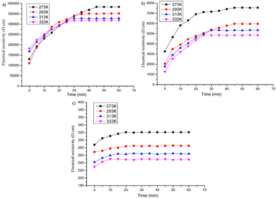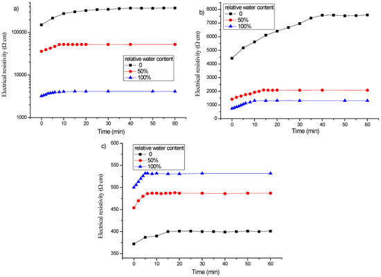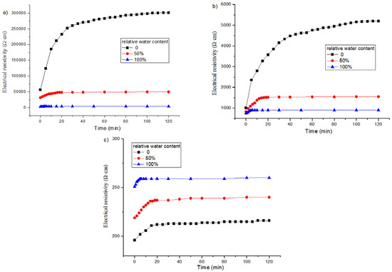 Figure 8 shows the electrical resistivity changes with time under different relative water contents for the specimens with 1, 2 and 3% content of graphene without freeze–thaw cycles. It can be found that when the graphene content is 1 or 2%, the polarization curve of the specimen in the wet state becomes gentle, the difference between the initial resistivity and the stable resistivity becomes smaller, and the final stable value decreases. Moreover, the greater the relative water content, the more obvious the effect. When the content of graphene is 3%, the effect of relative water content on the polarization effect is opposite.