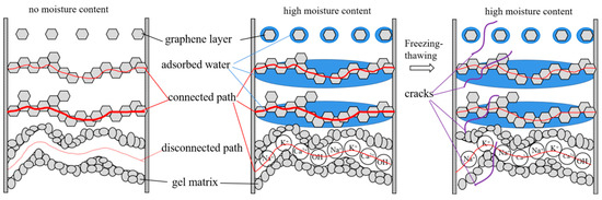 Figure 12 displays the microstructure analysis diagram of the effect of humidity on the electrical conductivity of graphene-based cement composites under freeze–thaw action. It can be seen from the left figure of Figure 12, that in the dry state, there are cement gel matrixes, close graphene and complete graphene chains in the composite that can conduct electricity. When a large amount of water is contained, as shown in the middle figure of Figure 12, pore solution in the matrix dissolves free ions such as Na+, K+, Ca2+ and OH− to form ion conduction, which can reduce the resistivity of the matrix by two orders of magnitude. At the same time, due to the huge specific surface area of graphene, water will be adsorbed on the graphene surface to form a layer of water film. When the water film is on graphene which is close to each other, it can reduce the resistance of electron transition and enhance the tunneling conduction effect. In the complete graphene contact conductive network, however, the water film will increase the resistance of free electrons to directional movement under the action of electric field, resulting in an increase in resistivity. After freezing and thawing, as shown in the right figure of Figure 12, the generation of new cracks and the increase of porosity enhance the ionic conductivity of pore solution. On the other hand, the distance between graphene is increased, the continuity of graphene in contact is destroyed, weakening the tunneling conduction and contacting conduction.
