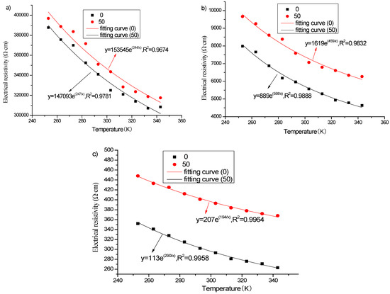 The thermosensitivity of the specimen is the relationship between the resistivity and the temperature of the specimen. The specimen was dried and cooled to room temperature and wrapped with plastic wrap to prevent the specimen from absorbing water. If the ambient temperature was above zero, a water bath was used to set the test temperature. A low temperature freezer was adopted to set the test temperature if the ambient temperature was below zero. The specimen was placed in the environment at the set temperature for more than five hours to achieve the same internal and external temperature. The resistivity of the specimen was measured after reaching the set temperature.