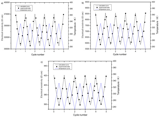 Calculated and measured value of electrical resistivity of specimens with different graphene contents subjected to multiple temperature rise and fall after freeze–thaw: (a) 1%; (b) 2%; (c) 3%.