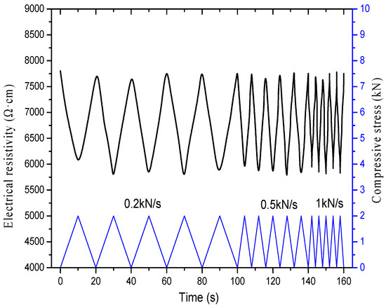 Figure 19 shows the relationship between electrical resistivity and compressive stress of specimens incorporating 2% content of graphene at loading rates of 0.2, 0.5 and 1 kN/s, respectively, after 50 freeze–thaw cycles. As presented in Figure 19, there is an excellent correspondence between the resistivity curve and the pressure curve at different loading rates, and the repeatability is favorable.