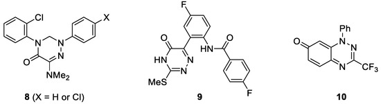 In recent years, monocyclic and bicyclic 1,2,4-triazine derivatives, including their oxo analogues, attracted considerable attention, as the compounds of that type exhibit a wide range of pharmacological properties, in particular antimicrobial and anticancer activity [43,44]. For example, in 2010 Krauth et al. reported on 1,2,4-triazin-5-ones of type 8, which showed distinct antiproliferative effects against the chronic myeloid leukemia cell line (K-562) combined with remarkably low cytotoxicity (Figure 1) [45]. Later on, Khan et al. evidenced that the introduction of fluorine atom into aryl substituent improves the biological activity of the resulting 1,2,4-triazinones (such as 9), which were recognized as potent CDK2 and anti-HIV-1 inhibitors [46]. Furthermore, a promising thioredoxin reductase (TrxR) inhibition at submicromolar concentration by trifluoromethylated bicyclic triazinone 10 has also been discovered [47]. Thus, despite the reported progress in the synthesis and biological evaluation of fluorinated 1,2,4-triazinones, further development of synthetic protocols and the evaluation of biological properties of this group of N-heterocycles is of general importance.