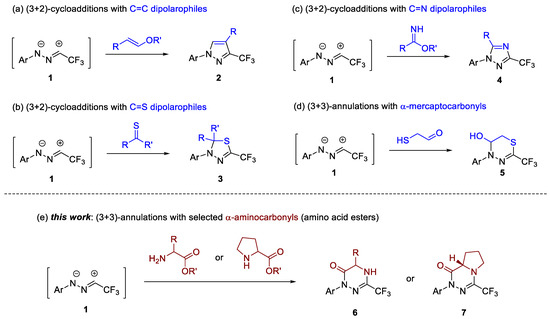 Exemplary applications of in situ generated trifluoroacetonitrile imines (1) in synthesis of: (a–c) 5-membered N-heterocycles available via (3+2)-cycloadditions with C=C and C=X dipolarophiles leading to pyrazole, 1,3,4-thiadiazole, and 1,2,4-triazole derivatives 2–4, respectively; (d) 1,3,4-thiadiazines 5 available through (3+3)-annulation with α-mercaptoacetaldehyde; (e) monocyclic and bicyclic 1,3,4-triazin-6(1H)-ones 6 and 7 reported herein.
