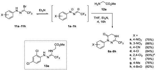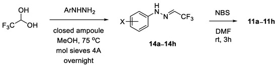 With the optimized reaction conditions in hand, a series of variously substituted nitrile imines 1b–1h were checked in the reaction with glycinate 12a (Scheme 2). The required nitrile imine precursors of type 11 were prepared according to the general literature protocols by condensation of arylhydrazines with fluoral hydrate [52], followed by NBS-mediated bromination of the first formed hydrazones 14 (Scheme 3) [25]. As shown in Scheme 2, the expected products were formed in high yields (74–93%), irrespective of the electronic nature of the substituent X. These observations nicely correspond to the previous results reported by Dalloul for reactions of some non-fluorinated nitrile imines with methyl glycinate and other amino acid esters [56,57]. Notably, in the case of highly electron-deficient nitrile imine 1e functionalized at the N-termini with 2,4-dichlorophenyl group, the formation of a mixture of the target material 6e and the first formed acyclic adduct 13e in ca. 3:2 ratio was observed, which nicely evidenced the stepwise character of the studied (3+3)-annulation reaction. Therefore, in the next attempt, the resulting crude mixture was additionally refluxed for 2 h in order to accelerate the second ring-closure step, and after standard work-up, the product 6e was isolated in excellent yield (93%).