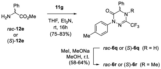 Synthesis of racemic and enantiopure phenylglycine-derived 1,2,4-triazin-6-ones rac-6q and (S)-6q, and their transformation into N-methylated analogues 6r.