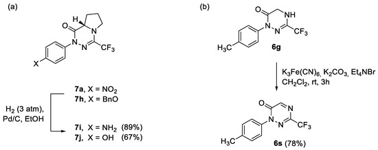 Selected transformations of title heterocycles: (a) synthesis of amino- and hydroxy-functionalized products 7i and 7j through catalytic hydrogenation of 7a and 7h, respectively; (b) selective oxidation of 6g with K3Fe(CN)6 under PTC-conditions leading to 1,2,4-triazin-6-one 6s.