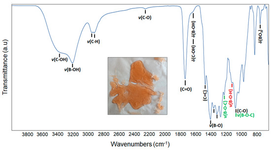 An amber-colored condensed gel was formed at the end of the first stage of the production process (Figure 1-inset). Figure 1 demonstrates the infrared spectra of the gel. The gel exhibits characteristic absorbance peaks of polyol-based condensed products at wave number regions consistent with previously reported studies [37,39]. Absorption bands associated with the C–OH and B–OH stretches are evident between 3000 and 3700 cm−1. The high intensity of these bands also indicates that the gel contains moisture. Well-resolved absorption bands belonging to C–H (2860–3000 cm−1) and C=O (1739 cm−1) stretching of carboxylic acid dimers are also apparent [40,41,42]. The bending modes of C–OH and B–OH are visible at approximately 1635 cm−1. The distinctive bands of B-O bonds can also be seen in the range of 1300–1500 cm−1. Absorption bands in the range of 760–650 cm−1 correspond to the bending vibrations of BO3 and B-O-O [43]. The peaks of B-O-C bonds (1231 and 1081 cm−1) confirm the formation of borate esters in the gel network through the dehydration and condensation reactions among starting materials [44,45,46].