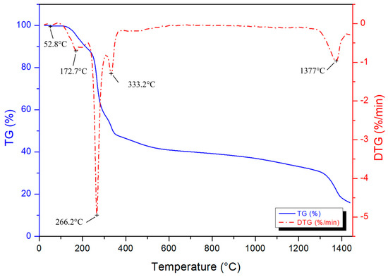 Thermogravimetric analysis was performed for determining the thermal decomposition behaviour of the condensed gel and boron carbide formation temperature. The TG/DTG result is presented in Figure 2. The observed weight loss starts with the evaporation of physical water, followed by boric acid dehydration boron oxide (B2O3) from 80 °C up to approximately 230 °C [38,47,48,49,50]. The decomposition and combustion of the polymeric network occurs from 250 to 400 °C, resulting in a 48% weight loss. The following 12% weight lost might be ascribed to the reduction of carbon char. The last DTG peak is associated with the boron carbide phase formation, which starts at approximately 1250 °C, reaching to the maximum rate of seed formation at 1377 °C, and continuing up to 1450 °C.
