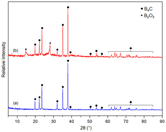 X-ray diffraction patterns (XRD) of the synthesised boron carbide powders are shown in Figure 3. It is observed that the formed main phase in both powders is B4C (CoD: 96-412-4698) [38,39]. The results are also evident that boron carbide with high crystallinity could be obtained from both the two- and four-hour thermally degraded precursors. Nonetheless, the sample synthesized from the two-hour thermally degraded precursor was pure phase, but the sample derived from the four-hour thermally degraded precursor contains cubic B2O3 (CoD: 96-201-6173) as residual phase [51]. This phenomenon likely originated from the reduction of the carbon content in the four-hour thermally degraded precursor due to it relatively larger thermal decomposition duration.
