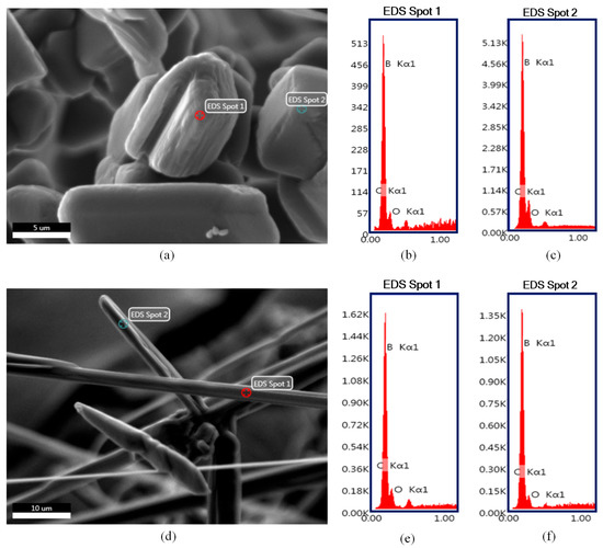 EDS point analysis results of the boron carbide particles with different morphologies are presented in Figure 5. It was found that regardless of their different morphologies, both polyhedral-equiaxed (Figure 5b,c) and fiber (Figure 5e,f) particles are boron carbide. The results also confirms that neither sample contains any elements other than boron, carbon, and oxygen. It is worth stressing that the presence of the oxygen signal might be attributed to the residual boron oxide phase as well as possible oxidation or hydration of boron carbide surfaces.