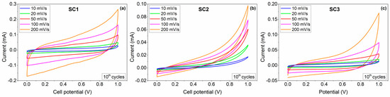 Cyclic voltammograms (CV) were recorded at various scan rates in the range of 10–200 mV.s−1 to characterize the capacitive response of the fabricated SCs. Figure 6 shows the CV curves obtained from the SCs assembled with boron carbide electrodes in a two-electrode configuration from 0 to 1 V in an aqueous 6 M KOH electrolyte. The CV curves of all SCs demonstrate typical quasi-rectangular CV profiles, symmetric in charging and discharging directions, indicating EDLC behaviour with slight Faradaic contributions to the charge storage. Above 0.8 V, all CV curves showed a strong deviation from the rectangular shape of EDLC, which was expected to be observed due to exceeding the normal operating voltage of KOH electrolyte (0.8 V). The output currents for SC1 were significantly higher than those of the SC2, indicating higher specific capacitance values of SC1. The CV results show that both symmetric and asymmetric devices delivered EDLC-dominant characteristics with small Faradaic contributions.