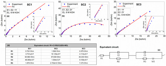 Experimental and fitted impedance data for the symmetric and asymmetric all-in-one supercapacitors in 6 M KOH electrolyte: Nyquist profiles of (a) SC1, (b) SC2, and (c) SC3; (d) fitted equivalent circuit elements of symmetric and asymmetric SCs; and (e) the equivalent circuit. The insets show high frequency regions of the spectra.