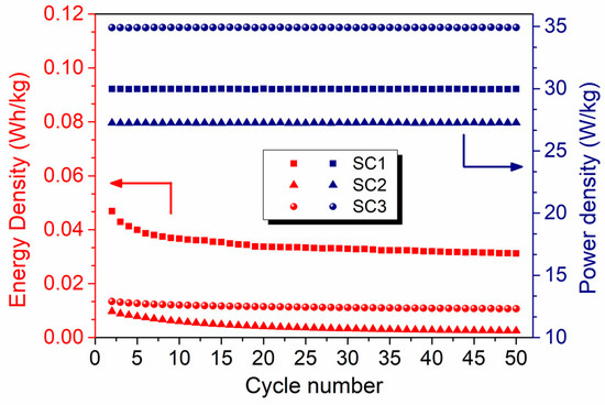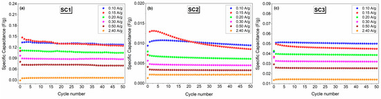 A similar trend was observed in the specific capacitance results presented in Figure 9a–c. Good cycling stability was observed with average specific capacitances of 0.13, 0.01, and 0.05 F.g−1 at a current density of 0.10 A.g−1 for 50 cycles for SC1, SC2, and SC3, respectively. The details of the specific capacitance calculations can be found in previously reported studies [54,55].