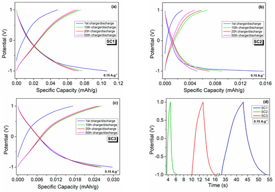 Galvanostatic charge–discharge profiles of the symmetric and asymmetric all-in-one SCs at a current density of 0.15 A.g−1: 1st, 10th, 20th, and 50th charge–discharge cycles of (a) SC1, (b) SC2, and (c) SC3; (d) 1st cycle charge–discharge curves of the fabricated SCs.